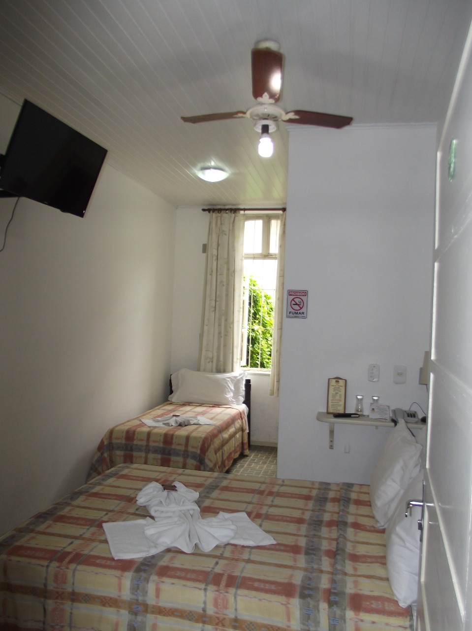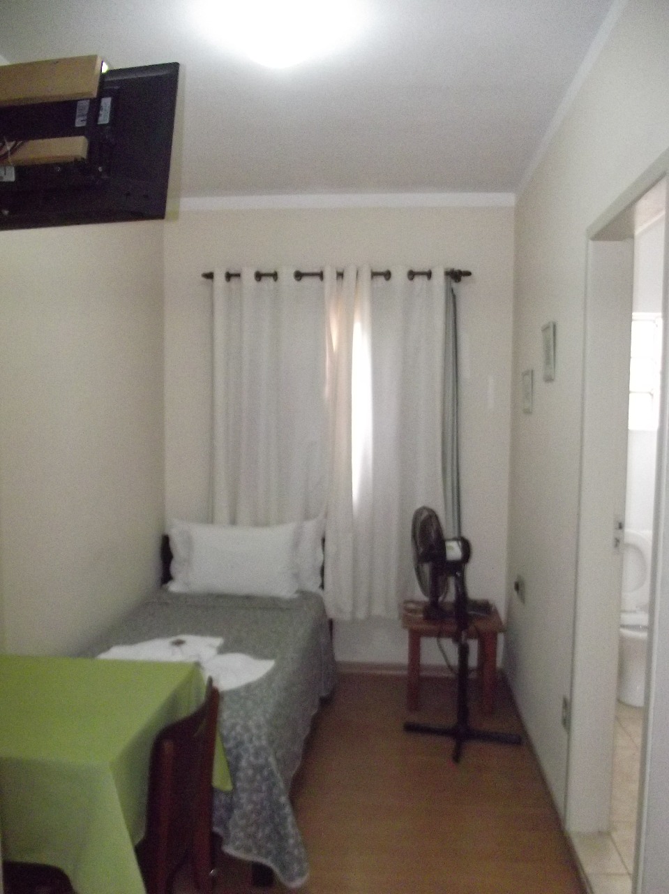 Possui ventilador de teto e televisor |
